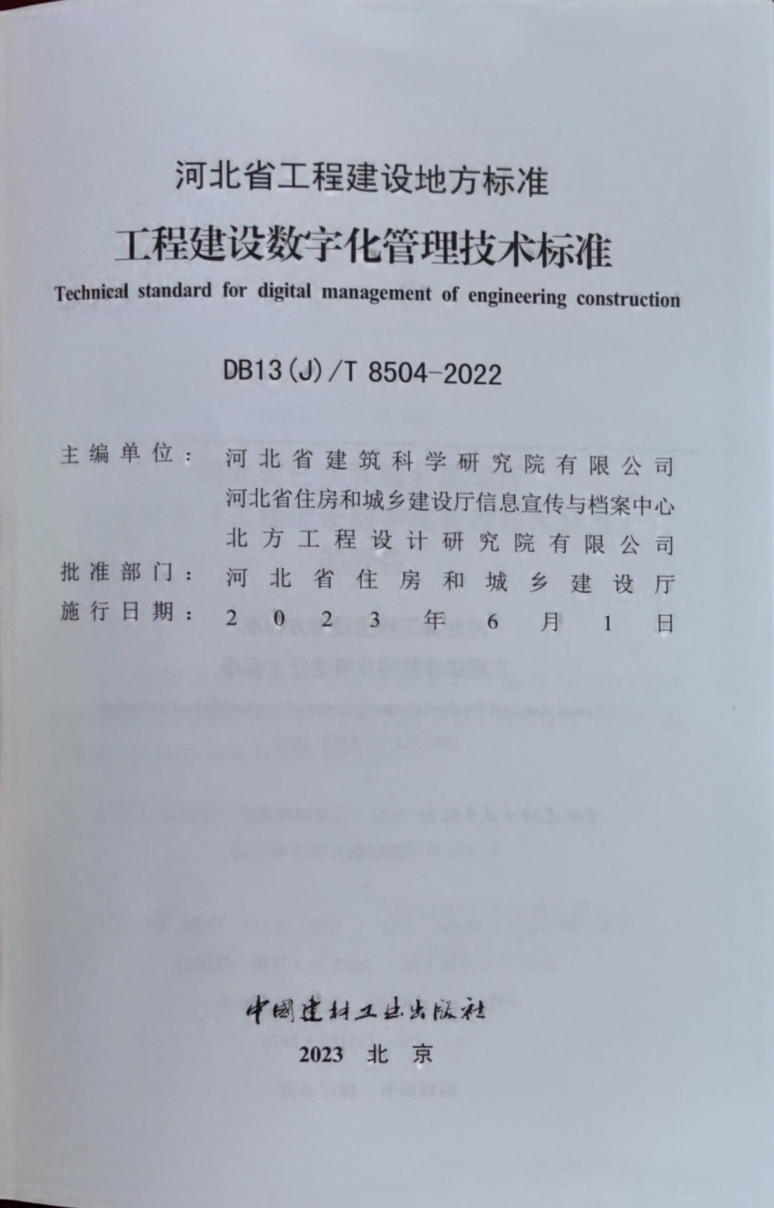 近日,由河北省建筑科學(xué)研究院有限公司、河北省住房和城鄉(xiāng)建設(shè)廳信息宣傳與檔案中心和北方工程設(shè)計研究院有限公司共同主編的《工程建設(shè)數(shù)字化管理技術(shù)標(biāo)準(zhǔn)》(DB13(J)/T8504-2022)已完成印刷,將于2023年6月1日起實施。